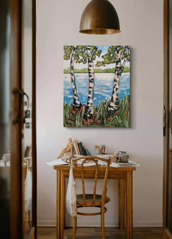 Bold, expressive brushwork brings the scene to life, the distinctive black and white patterns of the birch trunks, the lively greens of the grass and foliage, and the cool blues of the water beyond. The composition draws your eye through the trees to the tranquil lake, inviting you to pause and breathe in the calm. Each element is simplified and stylized, focusing on the essential shapes and colors that evoke a sense of peace and renewal.