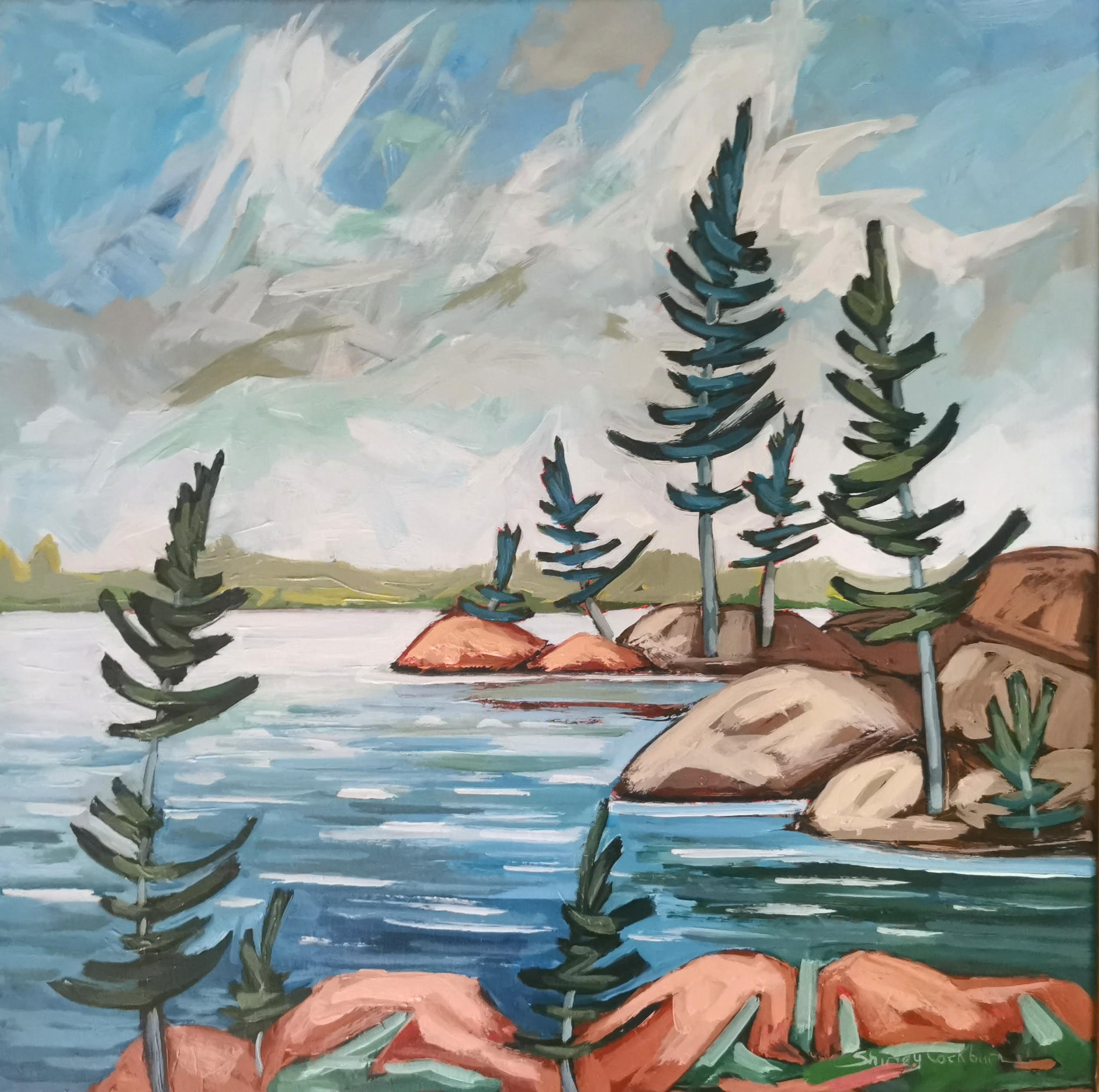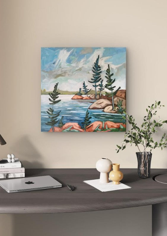 1564 Rocky Shores 1-25 This 20x20 inch acrylic painting captures the essence of Northern Ontario's wild beauty, windswept pines, sunlit rocks, and shimmering water beneath a vast sky. Expressive brushwork and bold color bring energy and movement to the scene, inviting you to pause and breathe in the tranquility of nature.