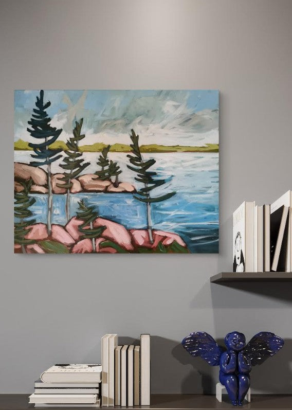 1563 Standing Tall 1-25 This 16x20 inch acrylic painting is a celebration of the rhythmic beauty found along Northern Ontario's lakeshores. Windswept pines rise from sun-warmed rocks, their silhouettes dancing against a sky alive with movement. The water shimmers in layered blues, reflecting the ever-changing light and the quiet strength of the land.