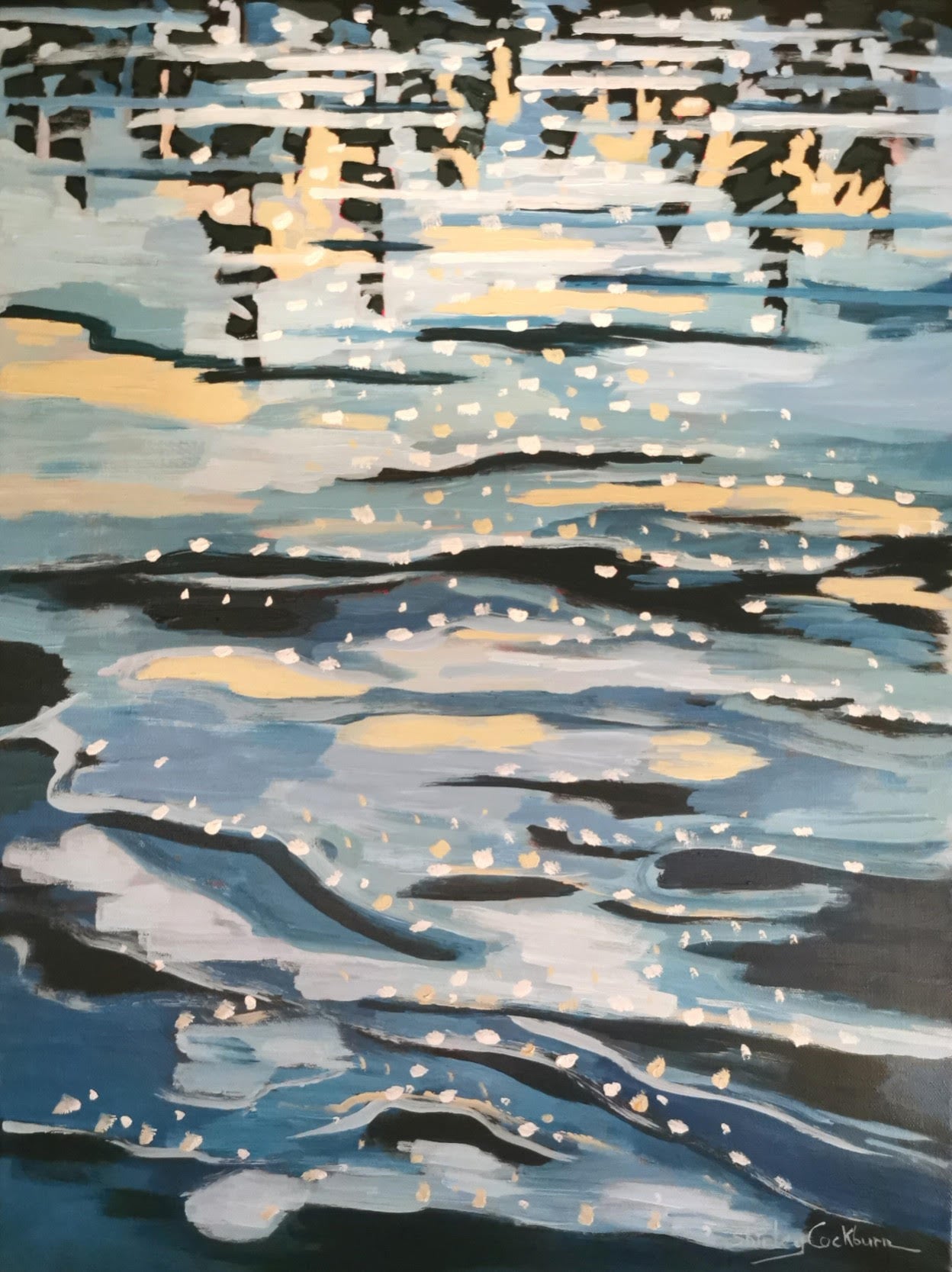 1620 Shimmering Serenity 1-26 The expressive painting captures the magic of sunlight sparkling across a quiet lake. Soft blues and gentle golds ripple through the water, creating a sense of movement and tranquility. The abstract brushwork invites you to pause and enjoy the peaceful beauty of nature's reflections, bringing a calming, luminous touch to any space.
